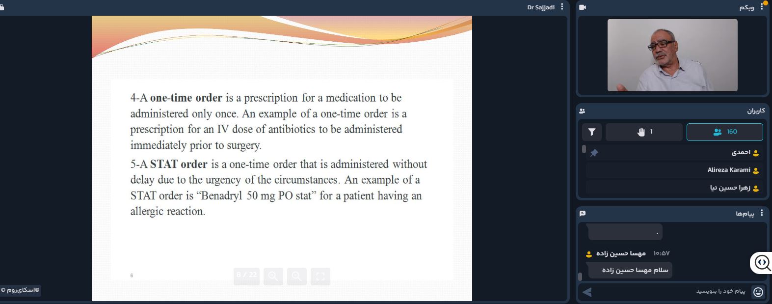 وبینار "نسخه نویسی، دستورات داروئی و اشکال داروئی" در تاریخ 1 خردادماه  1404، از طریق سامانه برگزاری وبینارهای اسکای روم برگزار گردید.