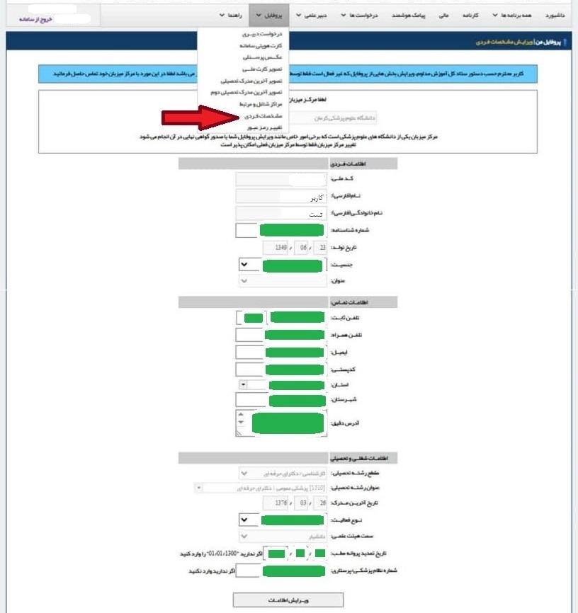 توجه نمایید که تکمیل تمامی اطلاعات خواسته شده  )بخش های سبز رنگ تصویر( ، شامل شماره شناسنامه، تلفن ثابت، تلفن همراه، ایمیل، کد پستی، آدرس دقیق، تاریخ تمدید پروانه و شماره نظام پزشکی/پرستاری الزامی می باشد.